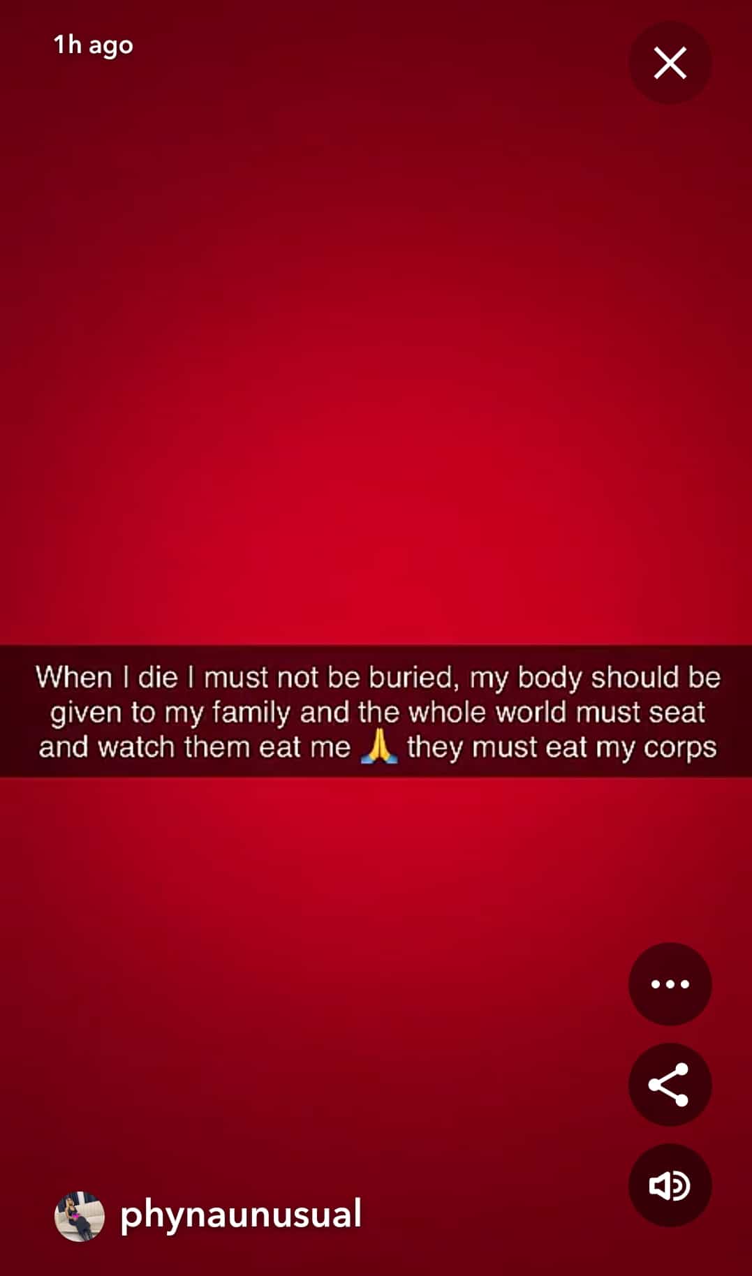 In a later post on her other media channel, Phyna wrote: “When I die, I must not be buried. My body should be given to my family, and the whole world must sit and watch them eat me. They must eat my corpse.”