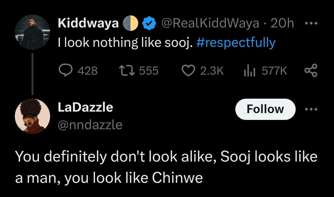 This comment surfaced in response to Kiddwaya’s recent post, where he dismissed comparisons to another contestant, Sooj, stating, “I look nothing like Sooj. #respectfully.”
