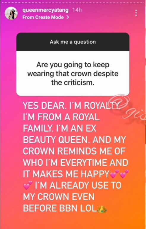 “YES DEAR. I’M ROYALTY. I’M FROM A ROYAL FAMILY. I’M AN EX BEAUTY QUEEN. AND MY CROWN REMINDS ME OF WHO I’M EVERY TIME AND IT MAKES ME HAPPY. I’M ALREADY USE TO MY CROWN EVEN BEFORE BBN LOL”