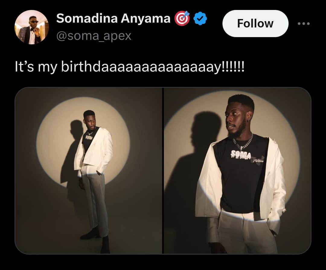 Soma, a housemate on Big Brother Naija’s (BBNaija) season in 2017, announced on his media page: “It’s my birthdaaaaaaaaaaaaaay!!!!!!”