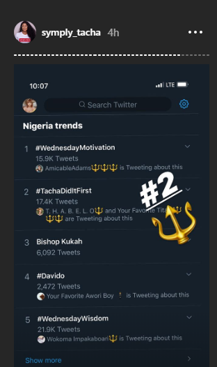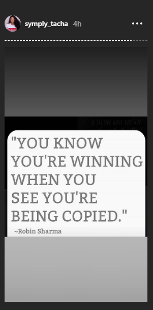 Tacha acknowledged the claim made by her fans and also disclosed that “she knows she is winning” because she is getting copied. She also acknowledged a Twitter campaign which came with hashtag of #Tachadiditfirst.