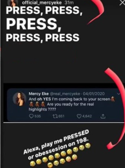 Mercy who won the 2019 edition of the Big Brother Naija Reality show, fired back at Tacha by pointing out that she hinted on starting off her reality show via a tweet she shared on January 4, 2020, weeks before she (Tacha) announced and launched hers.