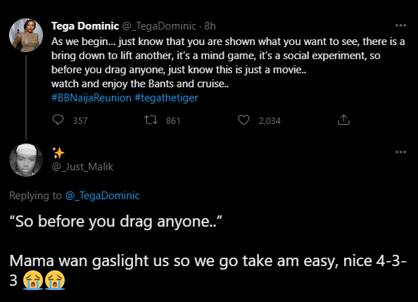 “As we begin… just know that you are shown what you want to see, there is a bring down to lift another, it’s a mind game, it’s a social experiment, so before you drag anyone, just know this is just a movie..