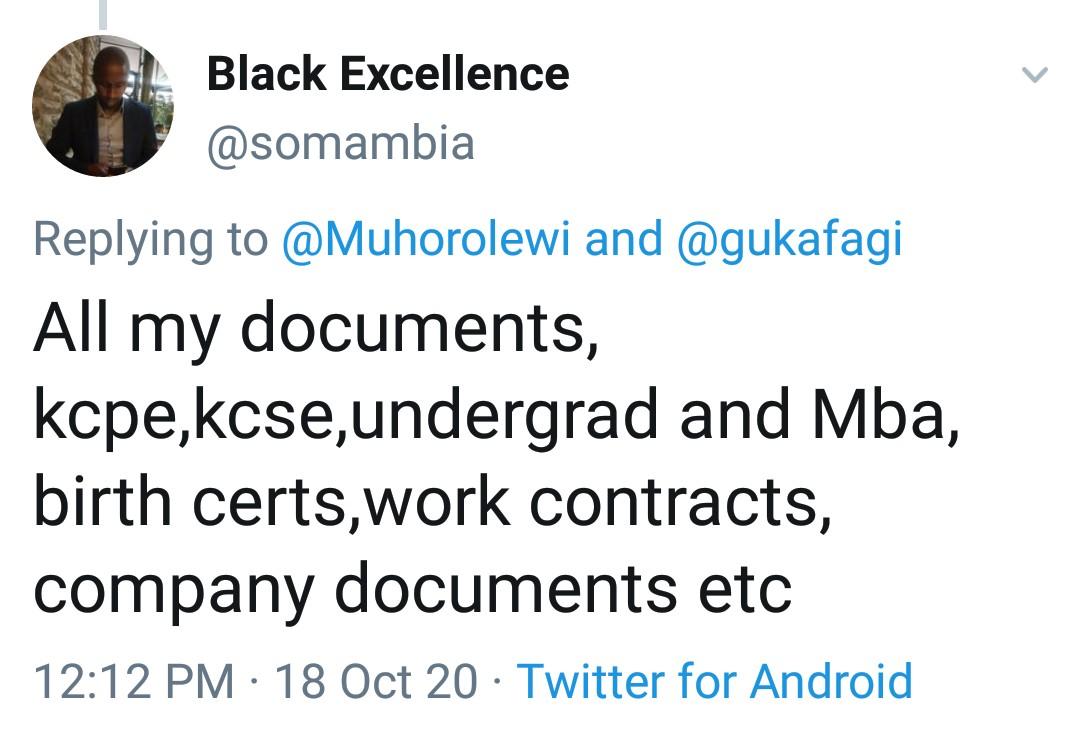 All my documents, kcpe,kcse,undergrad and Mba, birth certs,work contracts, company documents etc”