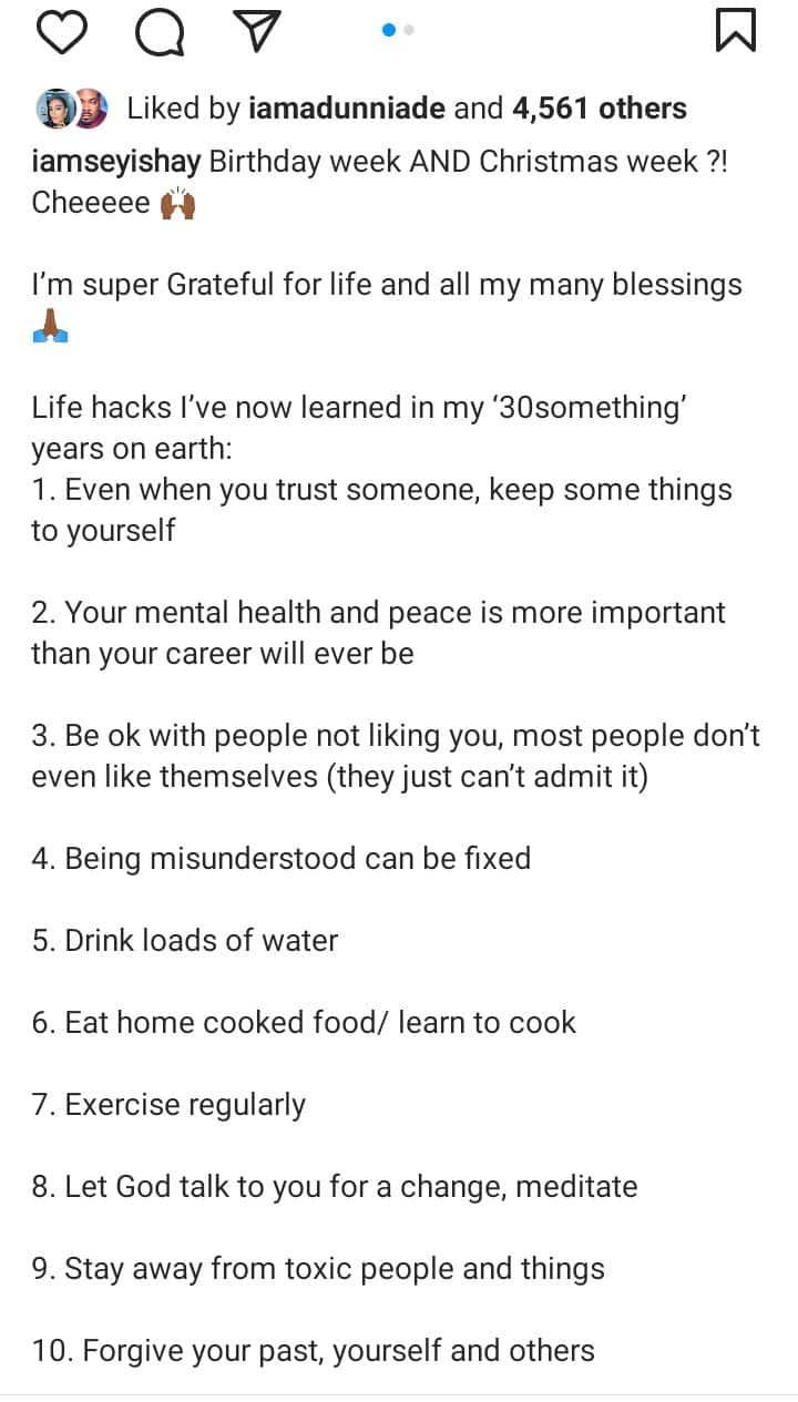 ‘Be Ok with people not liking you’ -Seyi Shay lists 10 life hacks as she counts down to her 36th birthday