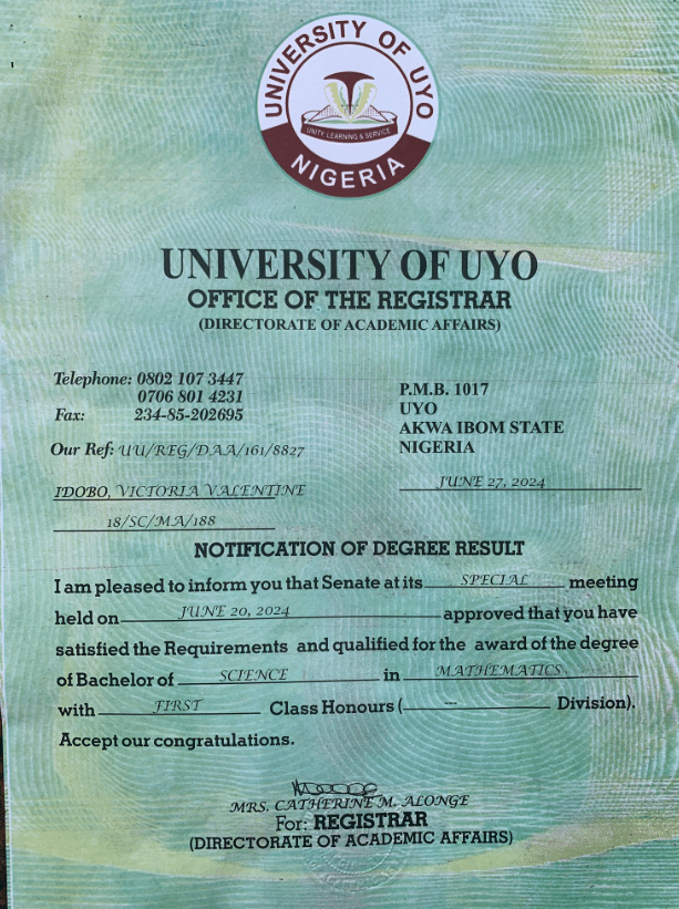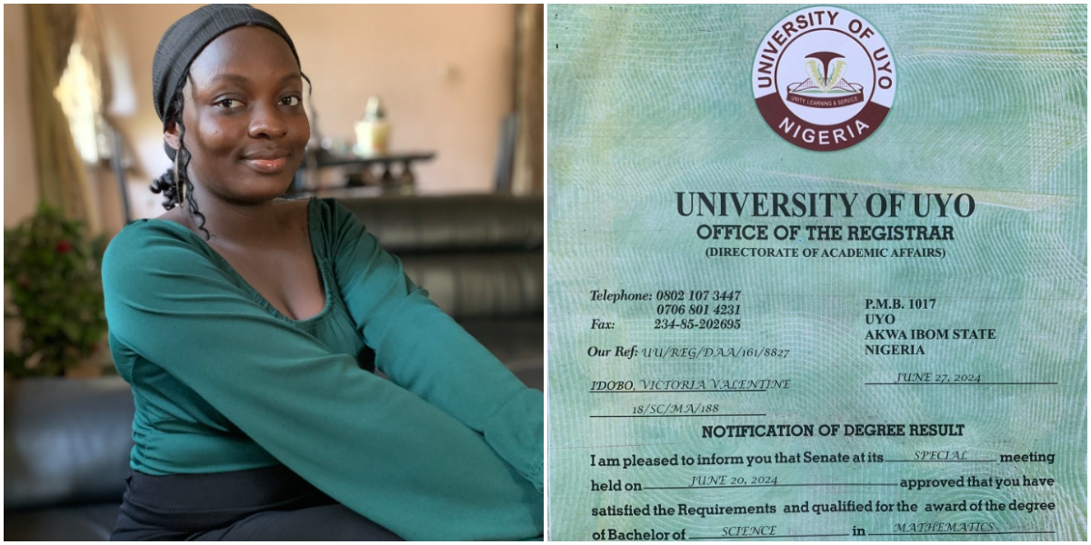 A Nigerian lady has captured the admiration of many online after achieving a first-class degree in mathematics from the University of Uyo (UNIUYO).
