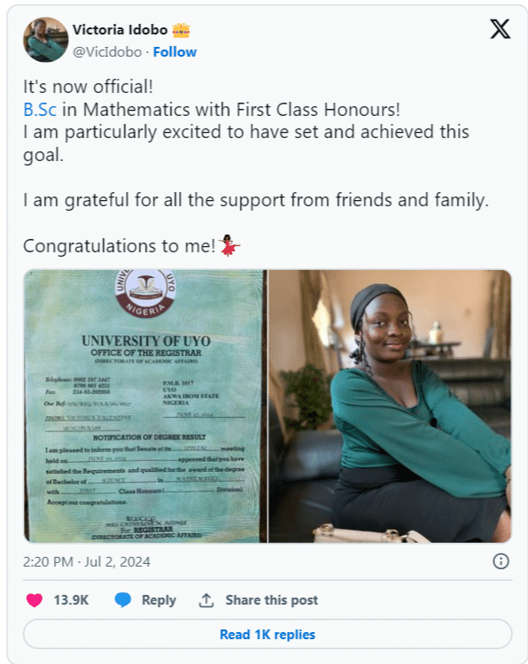 The graduate, Victoria Idobo, proudly took to the microblogging platform X to share her accomplishment, posting a picture of her degree certificate.
