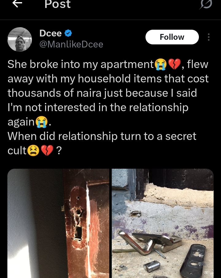 ”She broke into my apartment😭💔, flew away with my household items that cost thousands of naira just because I said I’m not interested in the relationship again😭. When did relationship turn to a secret cult😫💔 ?”, The tweet reads.