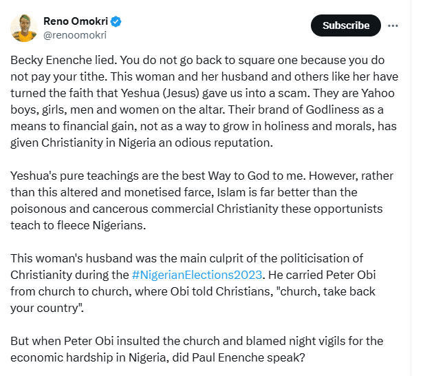 Popular political activist, Reno Omokri reacts to Paul Enenche’s wife, Becky’s statement about returning to square one after a person misses tithing.