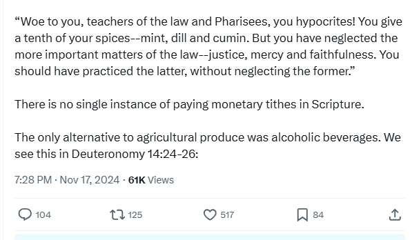 “Woe to you, teachers of the law and Pharisees, you hypocrites! You give a tenth of your spices–mint, dill and cumin. But you have neglected the more important matters of the law–justice, mercy and faithfulness. You should have practiced the latter, without neglecting the former.”