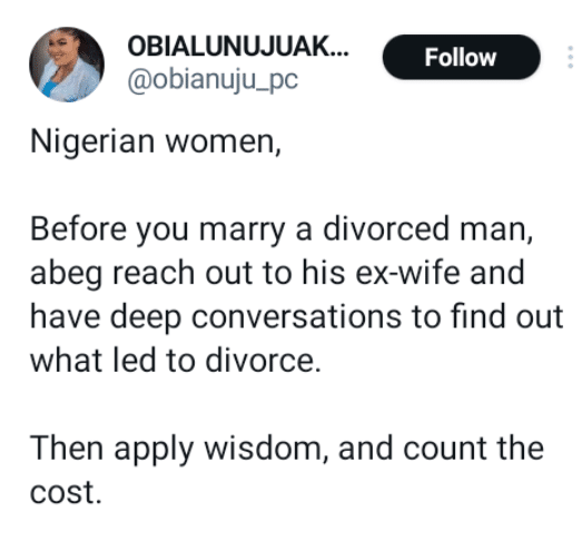 “Nigerian women, Before you marry a divorced man, abeg reach out to his ex-wife and have deep conversations to find out what led to divorce. Then apply wisdom, and count the cost.”