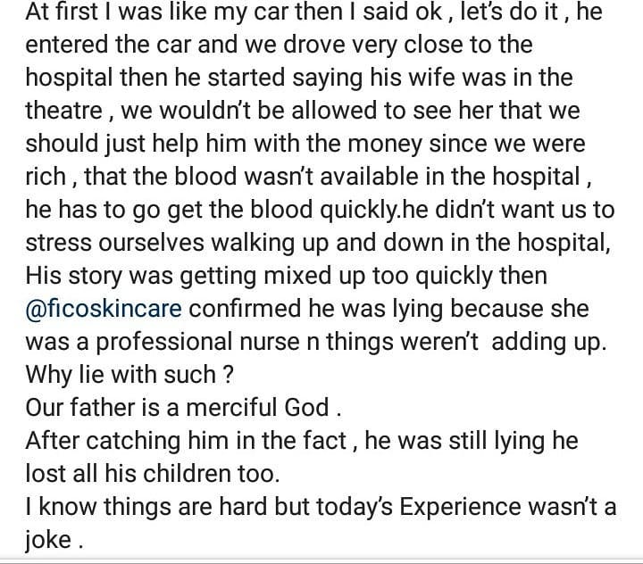 However, when they got to the gate of the hospital, the man refused to take them to his supposed sick wife. He claimed the wife was in the theatre and the doctors wouldn’t let them see her. He then added that he didn’t want to make them go through the stress of walking “up and down” in the hospital.