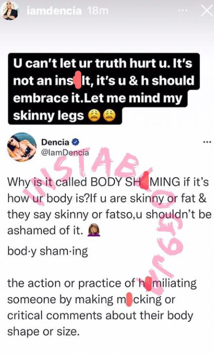 While taking to Instagram to pour out her thoughts, Dencia asked people to desist using the term “body shaming” against true descriptions of body size about them.