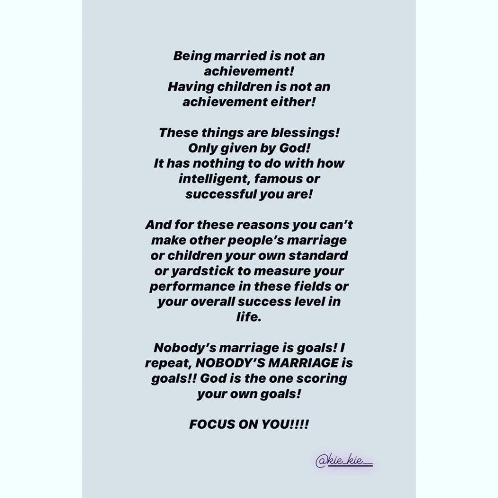 Nobody’s marriage is goals! I repeat, NOBODY’S MARRIAGE is goals!! God is the one scoring your own goals! FOCUS ON YOU!!!!”, she wrote.