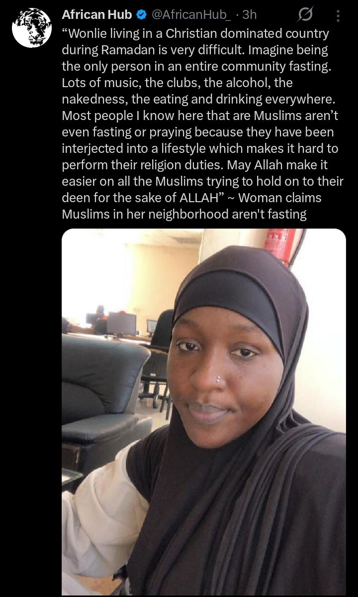 She further claimed that even Muslims in her area are struggling to observe the holy month due to cultural influences.