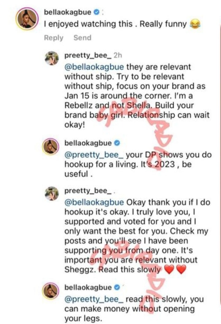 “@preetty_bee_ your DP shows you do hookup for a living. it’s 2023 , be useful,” Bella wrote.