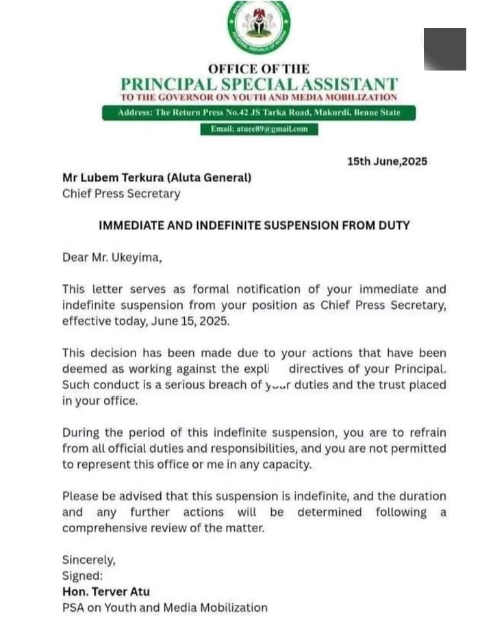 Atu Joseph, the Principal Special Assistant to the Benue State Governor on Youth and Media Mobilisation, has suspended his Chief of Staff, Mr. John Ukeyima, and Chief Press Secretary, Mr. Lubem Terkula, effective from June 14, 2025.
