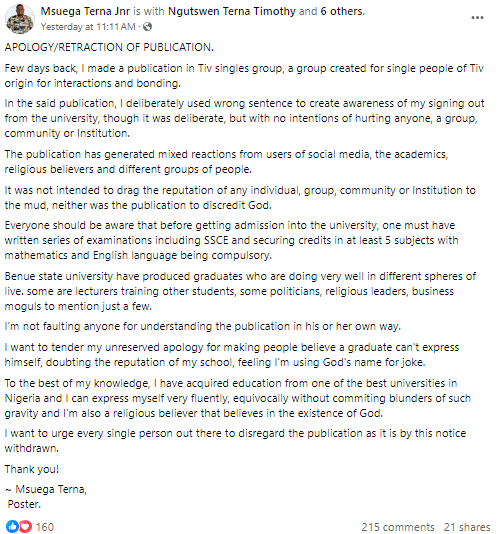 However, in a follow-up Facebook post on Sunday, Msuega Terna Jnr clarified that his viral graduation post was not intended to discredit his alma mater or cause harm.