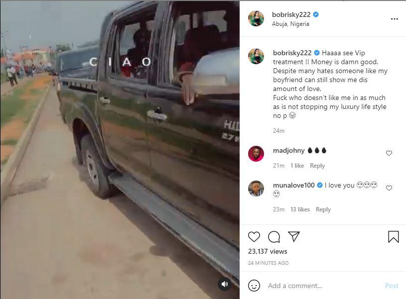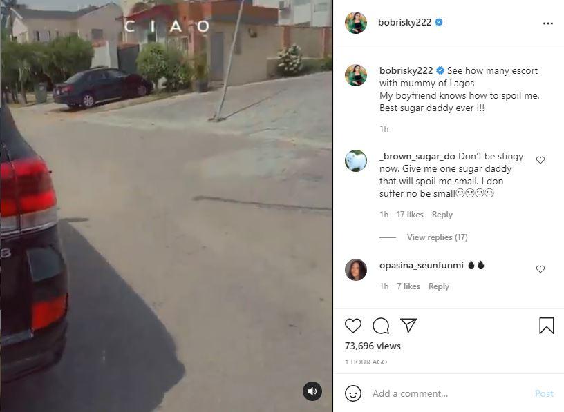 Popular cross-dresser, Bobrisky has taken to his official Instagram page to flaunt the formidable escort that his boyfriend provided for him.