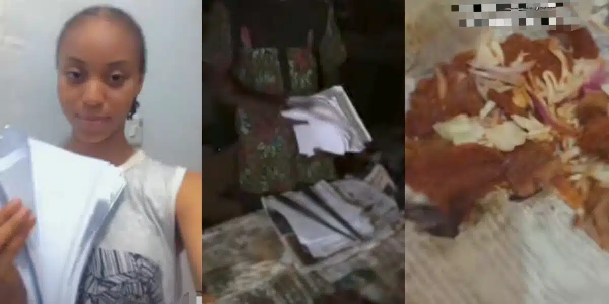 Pretty lady shares how she’s surviving the hard economy as she takes her canceled final year project papers to suya seller to exchange them for smoked spiced meat.