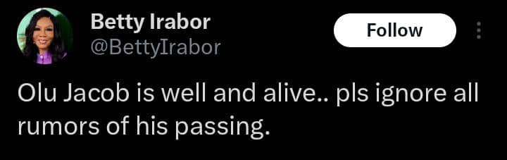 She wrote: “Olu Jacob is well and alive.. pls ignore all rumors of his passing. He is alive pls”