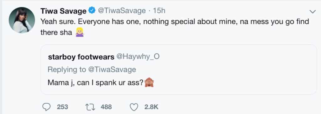 Between Tiwa Savage and a fan who wants to spank her backside
