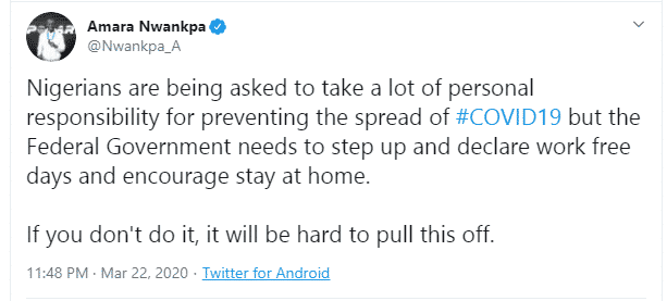“Nigerians are being asked to take a lot of personal responsibility for preventing the spread of #COVID19 but the Federal Government needs to step up and declare work free days and encourage stay at home. If you don’t do it, it will be hard to pull this off.”