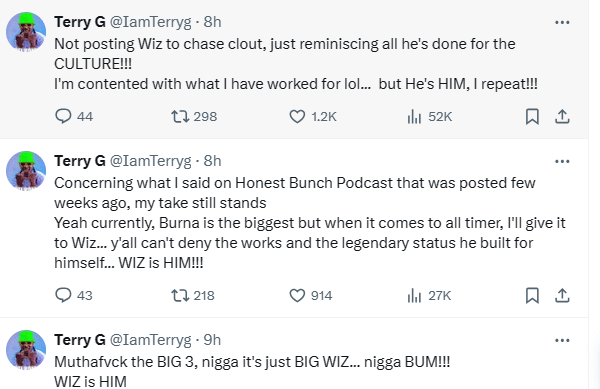 Amid the ‘Big 3’ beef, popular rapper, Terry G sets tongues wagging after failing to mention Davido, as he crowns Wizkid the ‘all-timer’ while explaining why Wiz is a legend.