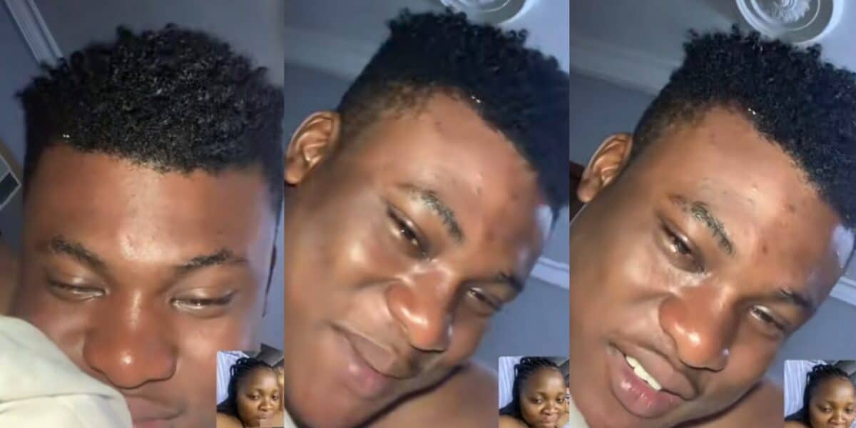Big boy reacts emotionally as he sheds tears over missing his girlfriend while speaking to her on video call.