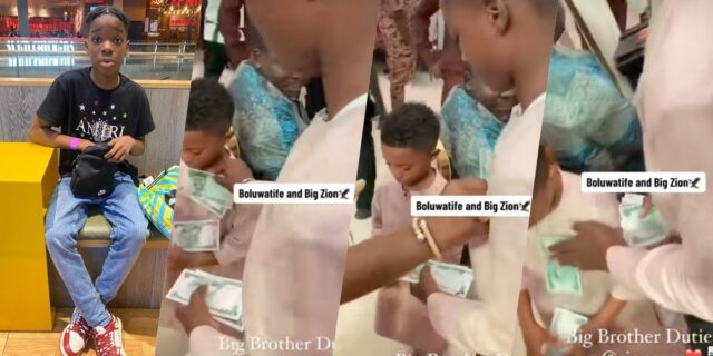 In an adorable video online, Boluwatife could be seen spraying cash on his junior brother, Zion as he is seen spraying naira notes on him.