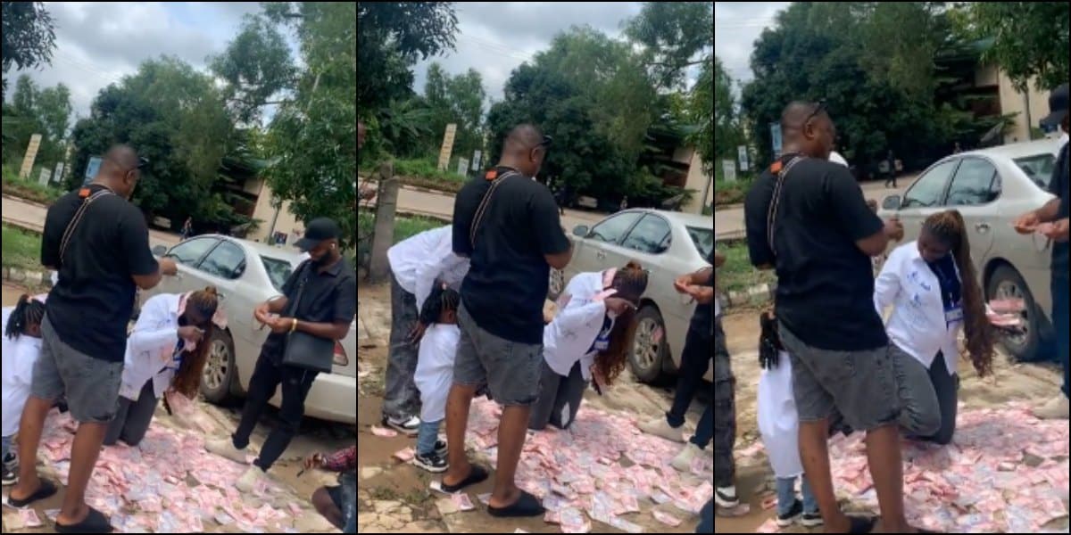 The video has caused a significant buzz online as the lady was seen kneeling on the floor while the men rained numerous 200 naira notes on her.
