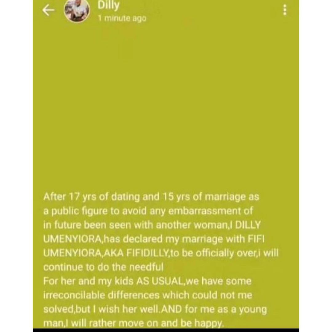 Well-known businessman Dilly Umneyiora has announced the end of his 15-year marriage with his wife, Fifi Umneyiora.