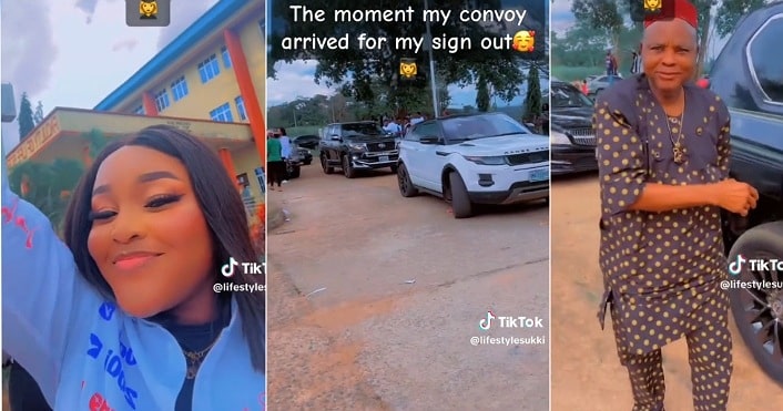 A Nigerian lady has shared the epic moment her wealthy family pulled up in a convoy at her school as she signs out.