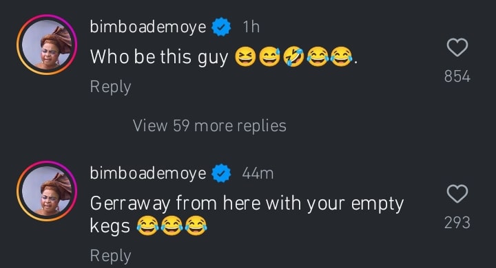 In his comment section, Bimbo questioned who he was as she told him to get out with his empty kegs.