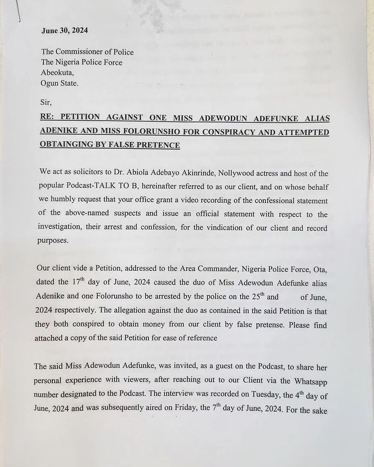 6. After this discovery, a petition was written by our attorney to the police to complain about the situation,and promptly, the Police investigated and arrested both Nike and her friend. The Police were also set to prosecute, and upon interrogation, Nike, who admitted that she was the one who approached Biola for the interview said she freaked out because people recognised her and said she felt that if she lied that she was dead Biola would remove the video. Police asked her if she reached out to Biola to remove the video at any point, and she said no. Her mother,who was there at the station ,orroborated the story.”