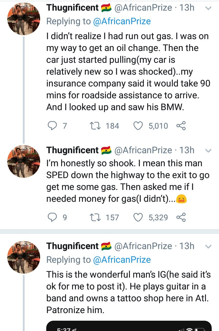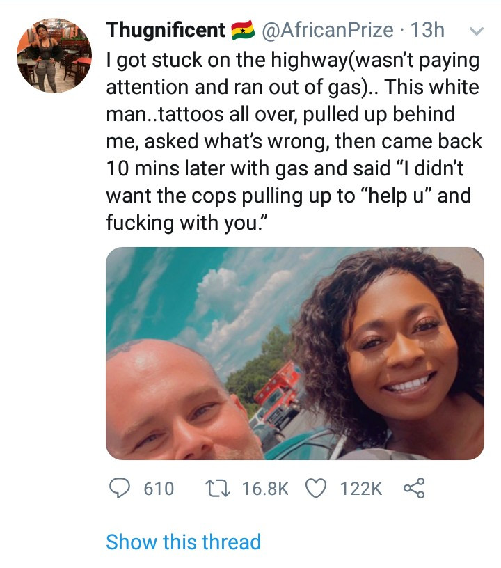 A woman has narrated how a white man came to her rescue after she ran out of gas while on a highway.