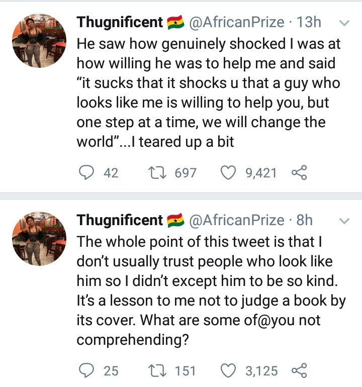 The lady added that she was surprised because she never expected help from someone like him and was wary at first.