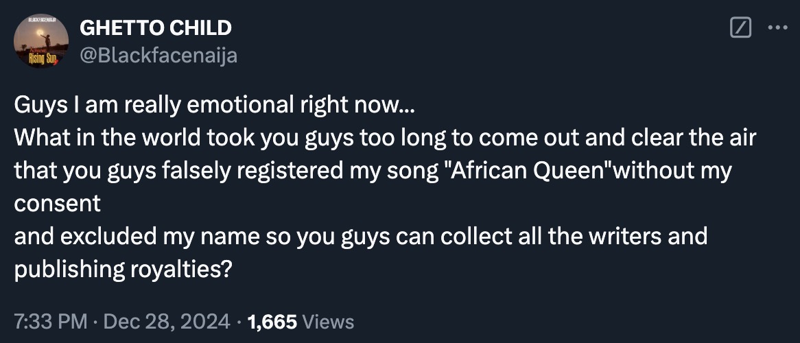 and excluded my name so you guys can collect all the writers and publishing royalties?— GHETTO CHILD (@Blackfacenaija) December 28, 2024