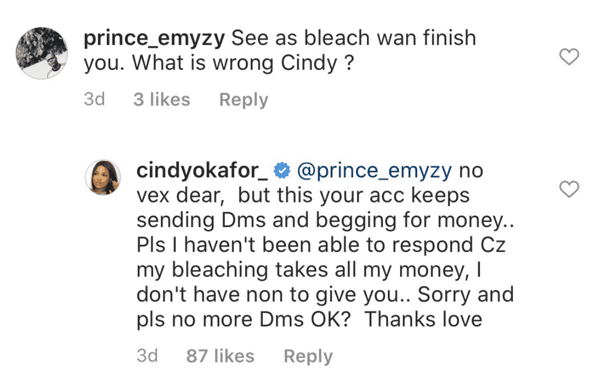 Cindy then replied, reminding him that he keeps begging for money and that she has not been able to respond because bleaching is taking all her money.