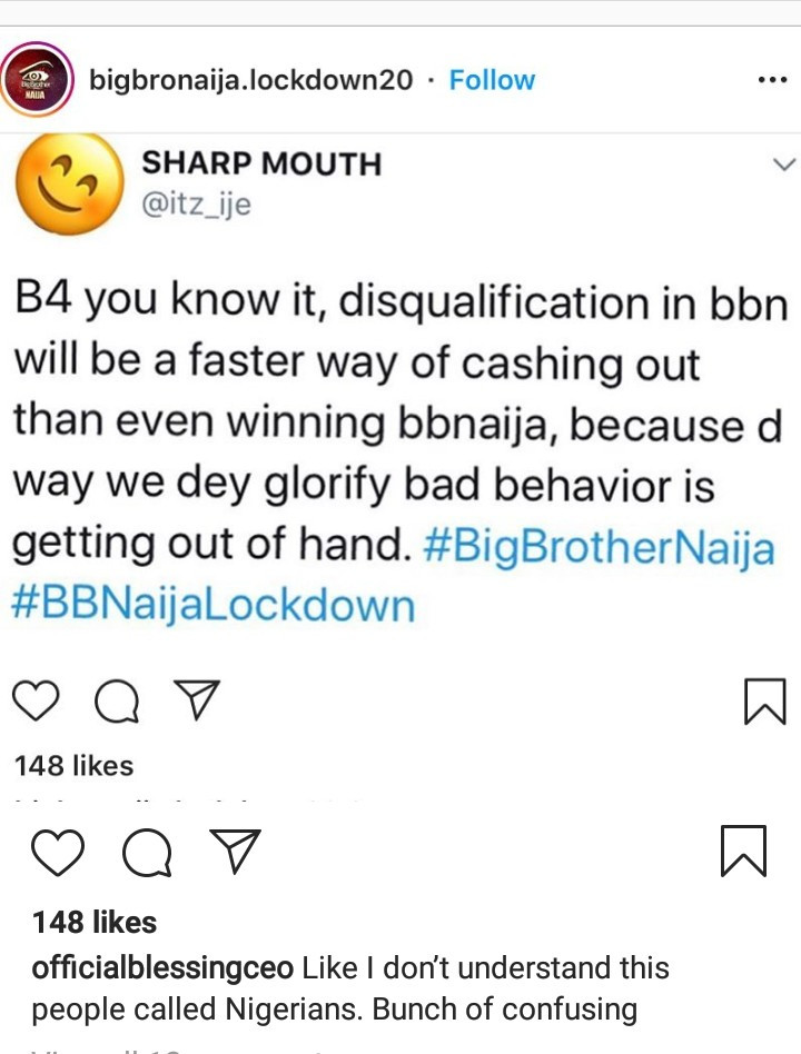 “Before you know it now, disqualification will be a faster way of cashing out than even winning BBNaija, because the way we dey glorify bad behaviour is getting out of hand.”