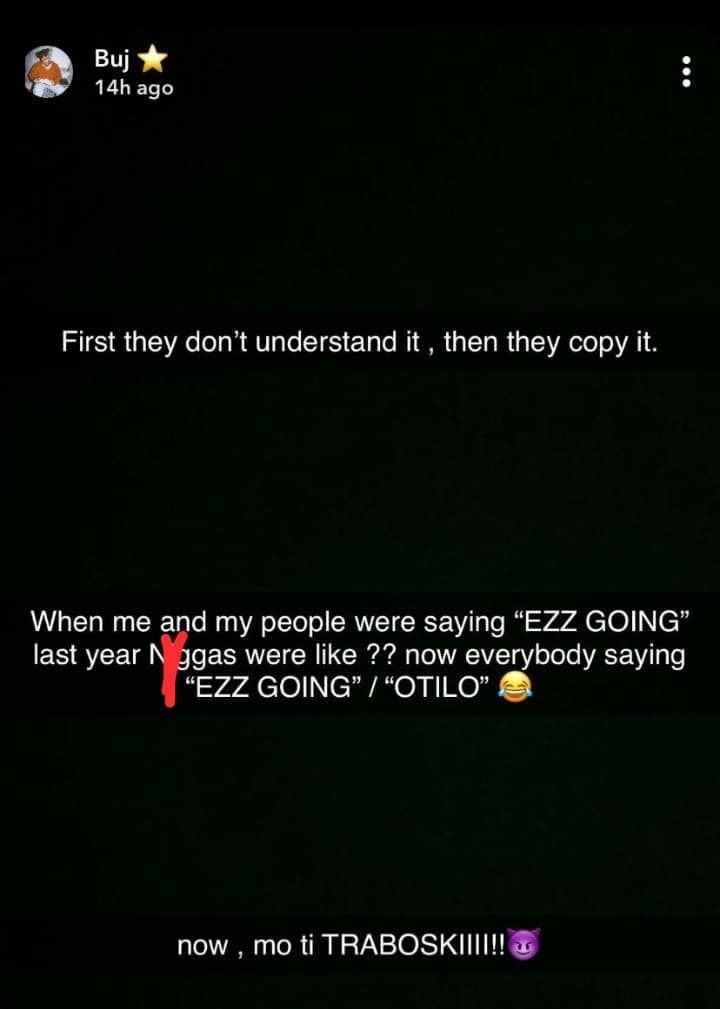 When me and my people were saying “EZZ GOING” last year N as were like ?? now everybody saying EZZ GOING” / “OTILO’ now , mo ti TRABOSKIIII!! ”