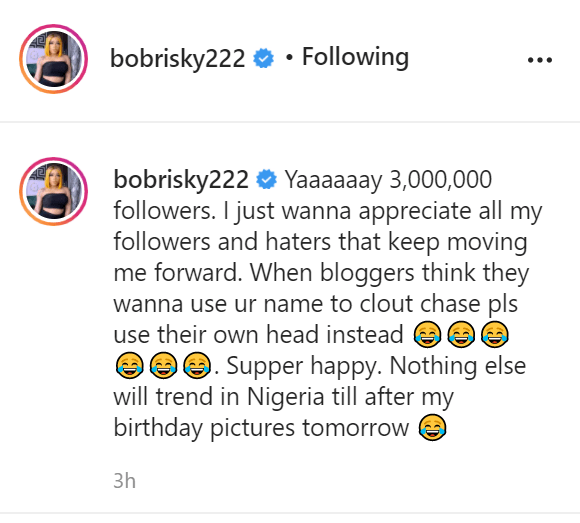 “Yaaaaaay 3,000,000 followers. I just wanna appreciate all my followers and haters that keep moving me forward. When bloggers think they wanna use ur name to clout chase pls use their own head instead ??????. Supper happy. Nothing else will trend in Nigeria till after my birthday pictures tomorrow ?”