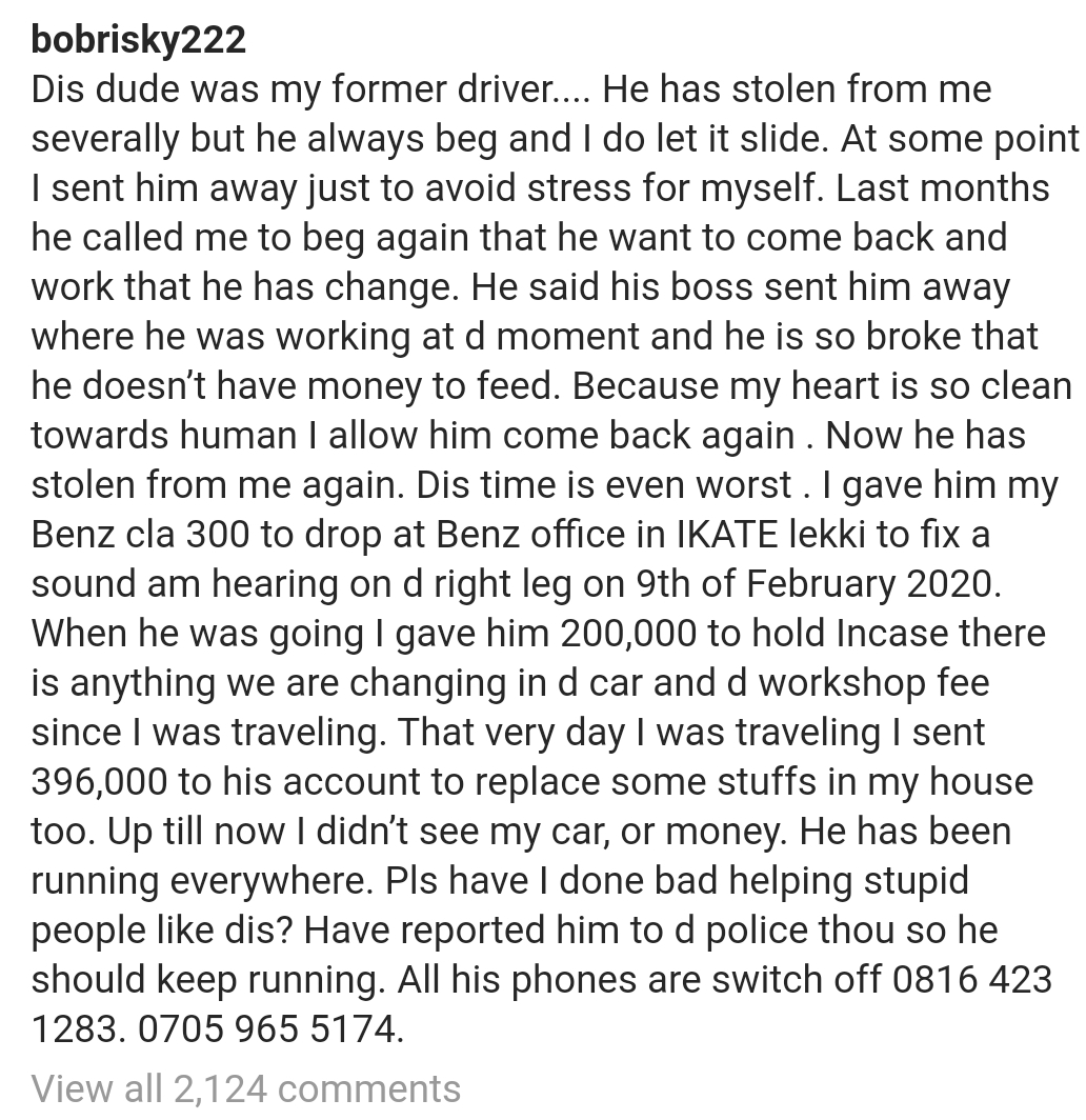 “Dis dude was my former driver…. He has stolen from me severally but he always beg and I do let it slide.