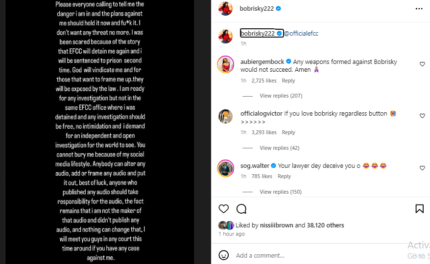 “Please everyone calling to tell me the danger i am in and the plans against me should hold itnow and fu*k it. It want any freatnomore. I was been scared because of the story that EFCC Will detain me again and i will be sentenced to prison second time. God will vindicate me and for those that want to frame me up.they will be exposed by the law. I am ready for any investigation but not the same EFCC office where i was detained and any investigation should be free, no intimidation and i demand for an independent and open investigation for the world to see. You