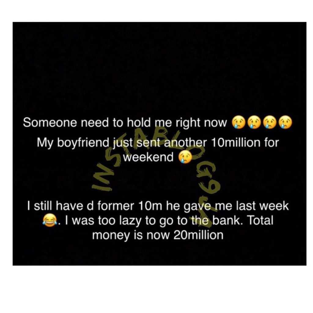 “Someone need to hold me right now. ??? My boyfriend just sent another N10million for weekend.