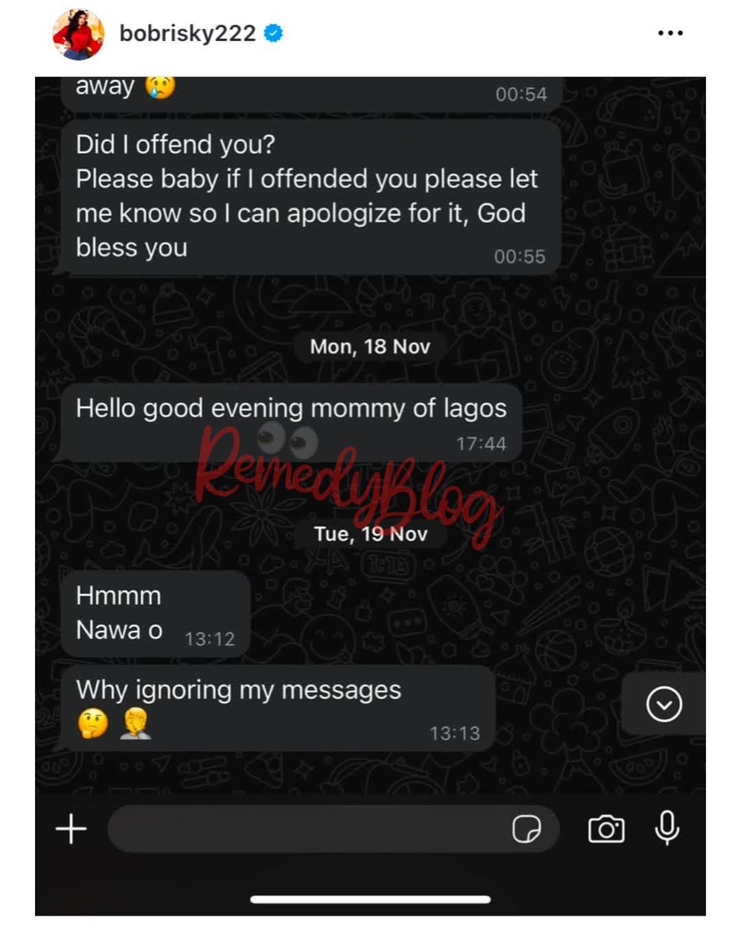According to Bobrisky, the reason why he keeps ignoring him it’s because he didn’t want to sound rude or block him.