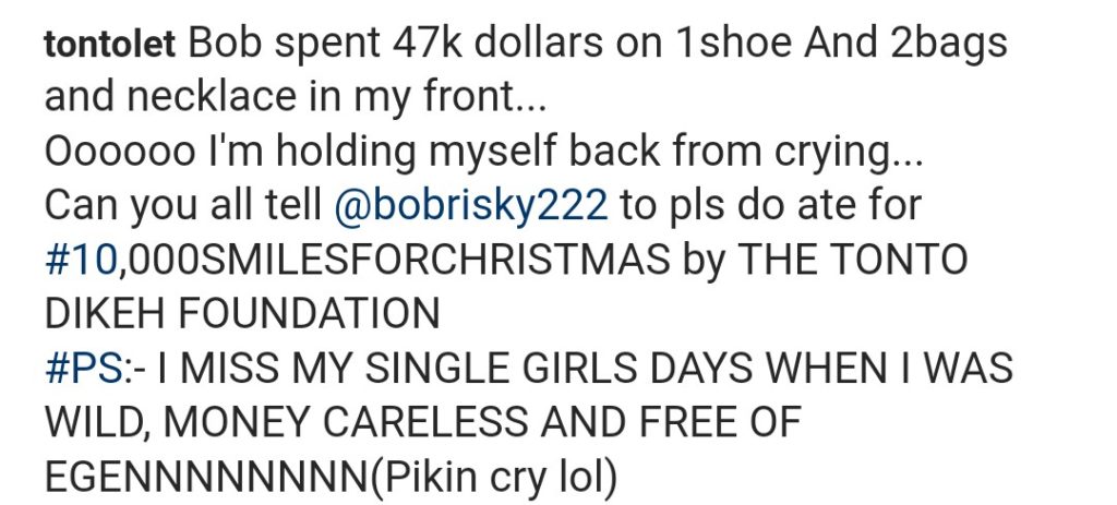 Controversial Actress, Tonto Dikeh revealed this on her Instagram page, while pleading with the male Barbie to donate some amount of cash to her foundation.