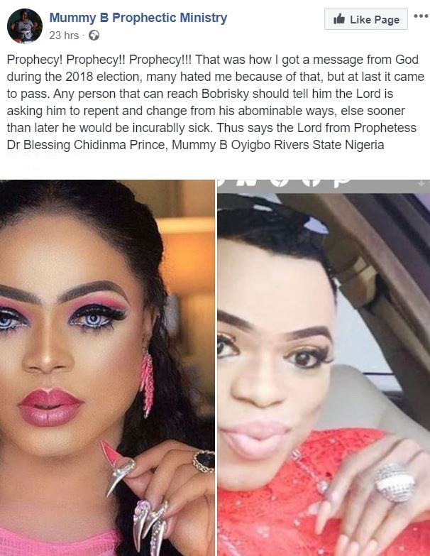 ”Prophecy! Prophecy!! Prophecy!!! That was how I got a message from God during the 2018 election, many hated me because of that, but at last it came to pass. Any person that can reach Bobrisky should tell him the Lord is asking him to repent and change from his abominable ways, else sooner than later he would be incurablly sick. Thus says the Lord from Prophetess Dr Blessing Chidinma Prince, Mummy B Oyigbo Rivers State Nigeria