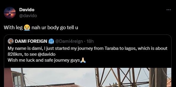 “Body go tell you” — Davido replies another fan who plans to trek from Taraba to Lagos to see him