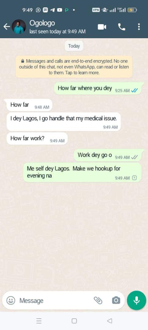 “I tried calling him and he already blocked my line, my friend tried help me chatting him up and he said he’s in Lagos.”